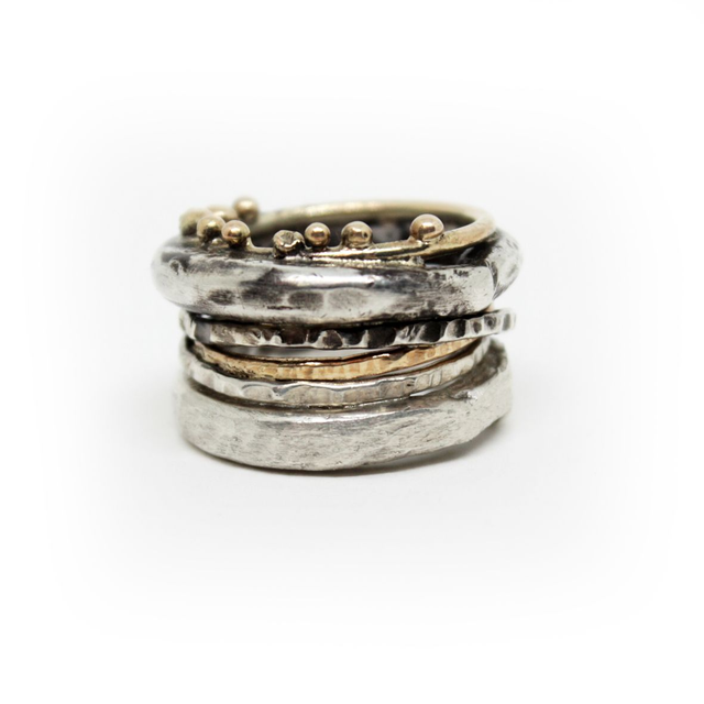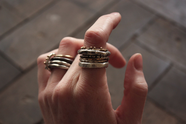 Anneau fils carrés et ronds. Formes aléatoires. Patine effet noircie par endroit, qui va s'estomper au fil du temps.