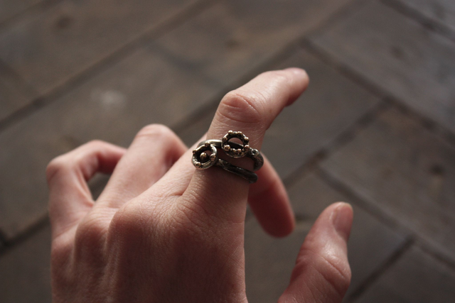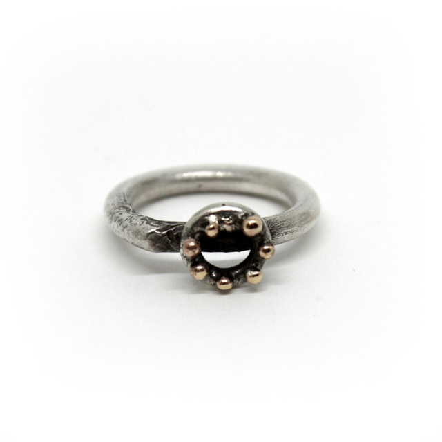 Anneau fil rond, forme aléatoire. Patine effet noircie par endroit, qui va s'estomper au fil du temps.