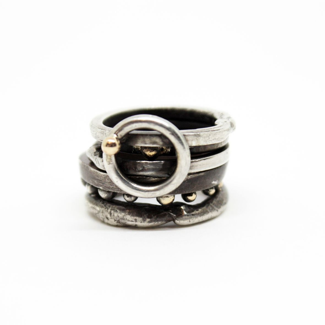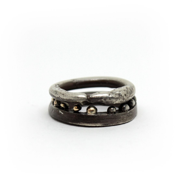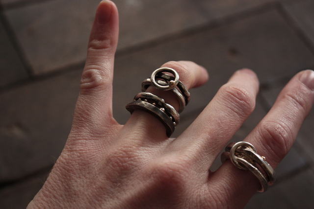 Anneaux fil carré et rond. Formes aléatoires. Patine effet noircie par endroit, qui va s'estomper au fil du temps.